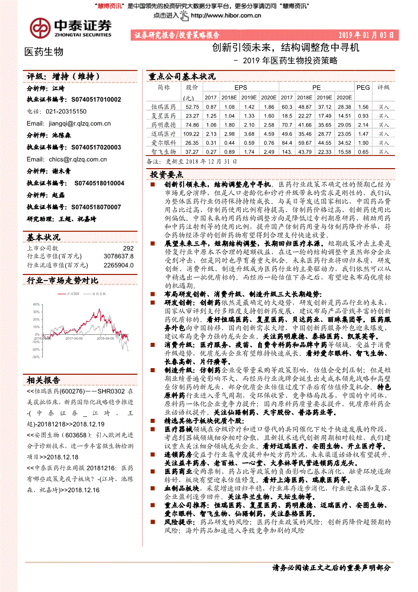 证券研究报告/投资策略报告2019年01月03日医药生物创新引领未来,结构调整危中寻机- 2019年医药生物投资策略 评级:增持(维持) 分析师:江琦执业证书编号:S02 电话 Email:分析师:池陈森执业证书编号:S03 Email:执业证书编号:S02 Email:.cn 分析师:谢木青执业证书编号:S04 分析师:赵磊执业证书编号:S07 研究助理:王超、祝嘉琦基本状况上市公司数292 行业总市值(百万元) 3078637.8 行业流通市值(百万元) 2265904.0 行业-市场走势对比公司持有该股票比例相关报告